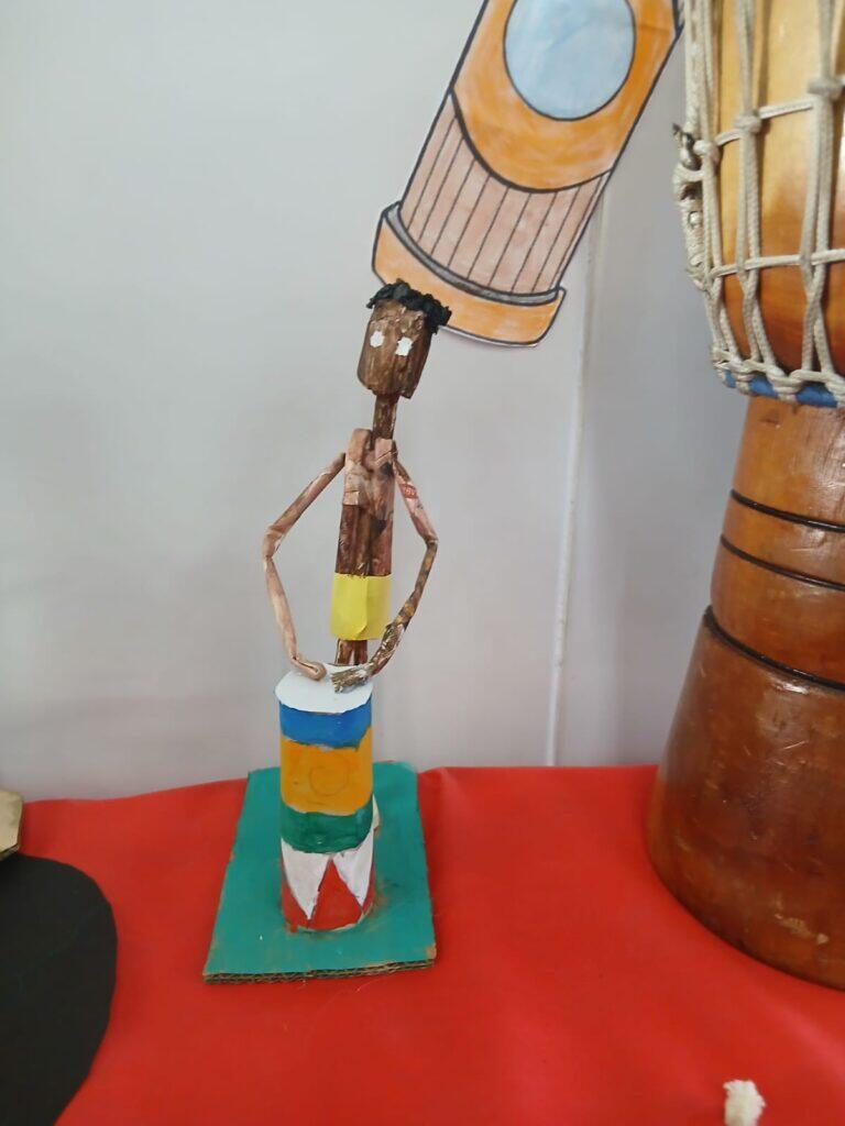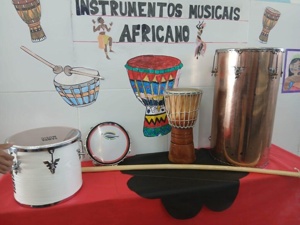 A professora Alice e seus estudantes apresentaram a história dos instrumentos musicais africanos, demonstrando o uso de chocalhos, berimbau, caxixi e pandeiro.