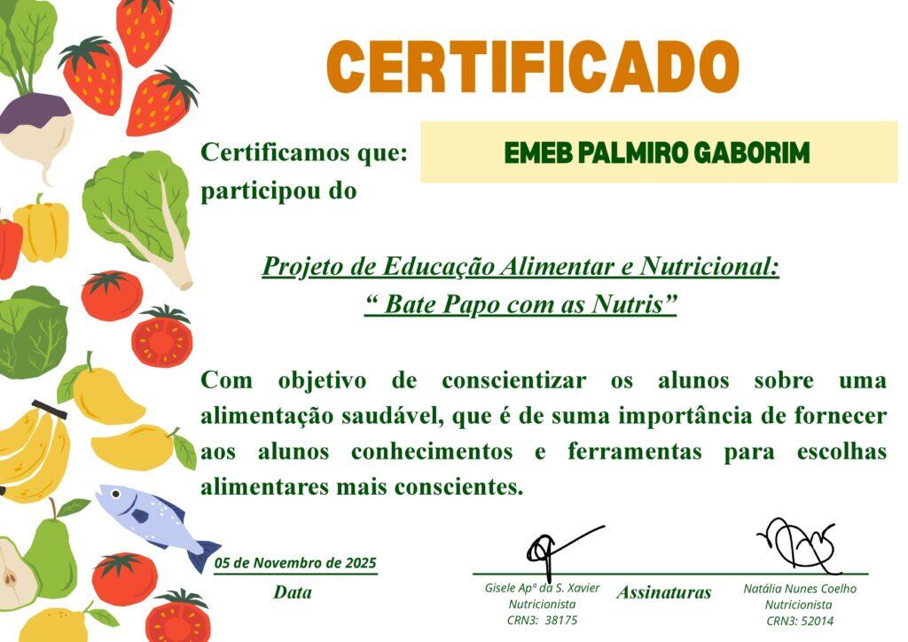 No dia 05 de Novembro de 2025, as Nutricionistas Natália Coelho e Gisele realizaram uma Educação Alimentar e Nutricional (EAN) na EMEB Palmiro Gaborim, com um bate-papo com as Nutricionistas com o objetivo de conscientizar os alunos sobre alimentação saudável, que é de suma importância para reverter este quadro, fornecendo aos alunos conhecimento e ferramentas para escolhas alimentares mais conscientes.