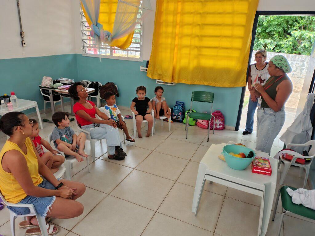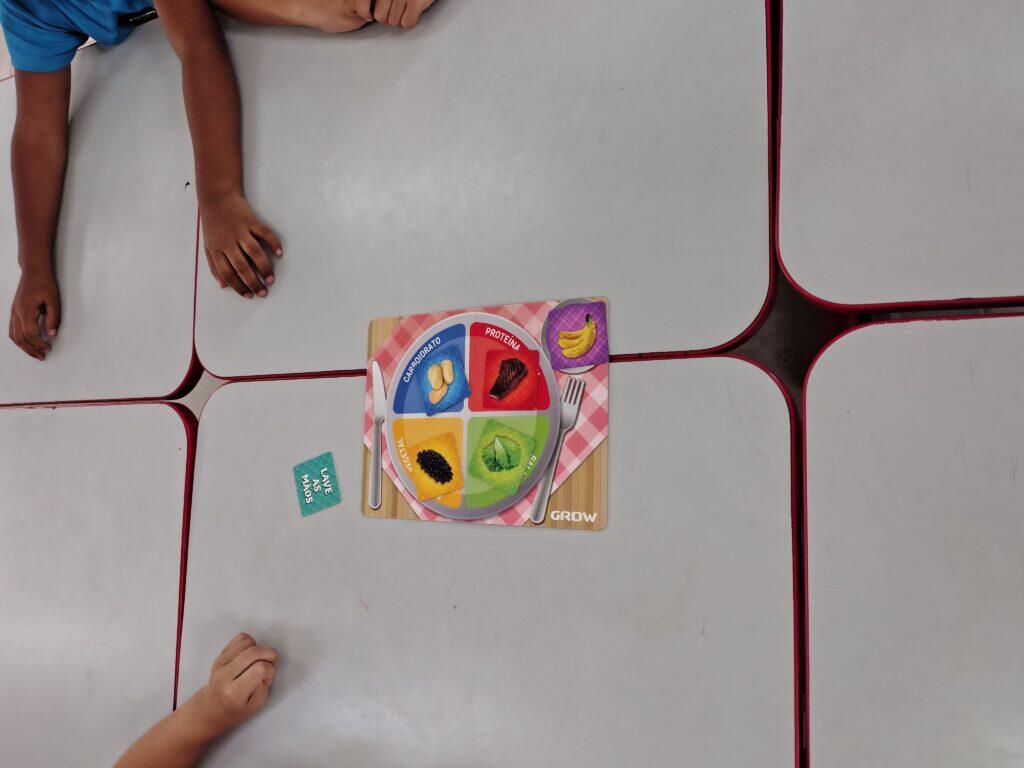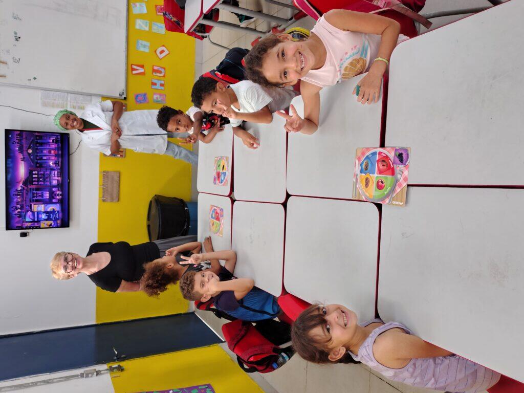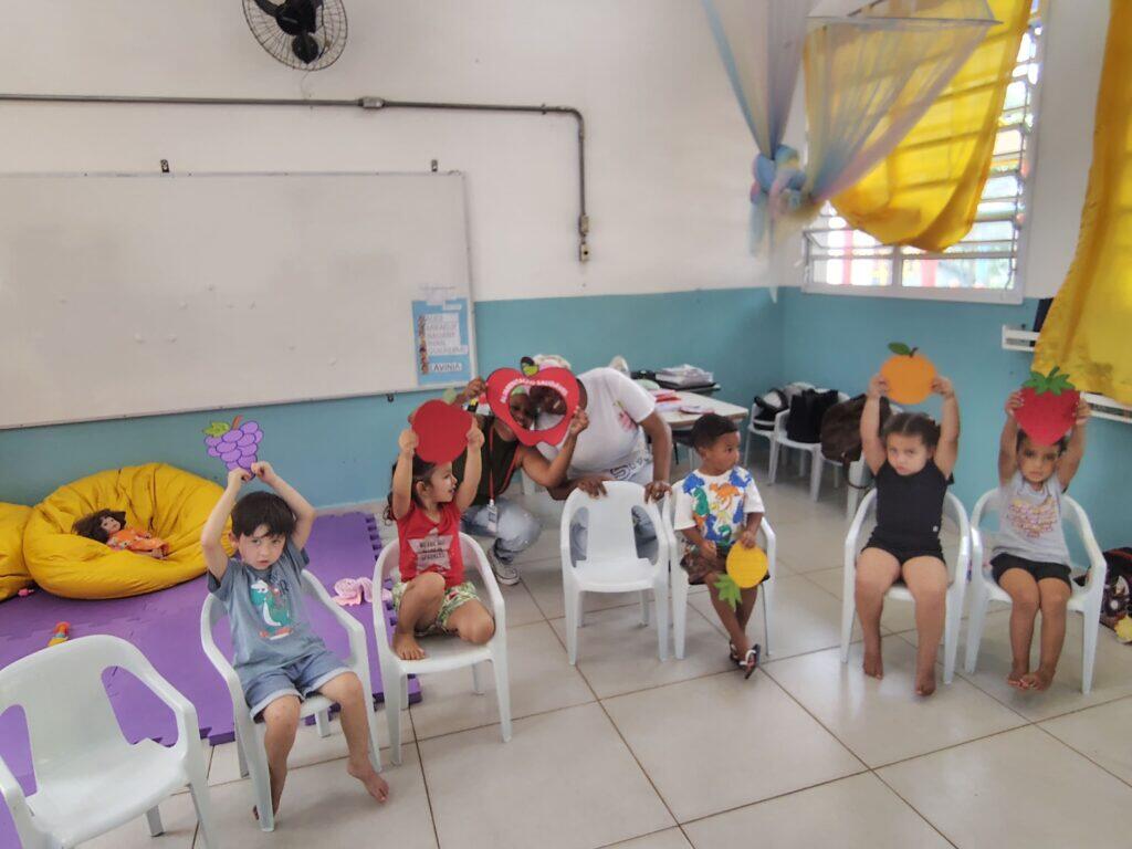 Durante a Educação Alimentar e Nutricional, passamos nas salas de aula, explicando sobre a importância de ter um prato colorido. Falamos sobre a combinação ideal da nossa alimentação: arroz e feijão. Após essa introdução, mostramos um prato colorido com os 5 grupos alimentar: carboidrato, proteína vegetal, proteína animal, salada e frutas. As crianças do pré-escolar montaram os pratinhos coloridos. Na creche, mostramos o pratinho colorido, figuras de frutas, vegetais e algumas frutas e vegetais in natura. As crianças se divertiram muito demonstrando as frutas e os legumes.