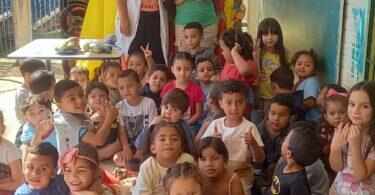 Durante a Educação Alimentar e Nutricional, passamos nas salas de aula, explicando sobre a importância de ter um prato colorido. Falamos sobre a combinação ideal da nossa alimentação: arroz e feijão. Após essa introdução, mostramos um prato colorido com os 5 grupos alimentar: carboidrato, proteína vegetal, proteína animal, salada e frutas. As crianças do pré-escolar montaram os pratinhos coloridos. Na creche, mostramos o pratinho colorido, figuras de frutas, vegetais e algumas frutas e vegetais in natura. As crianças se divertiram muito demonstrando as frutas e os legumes.