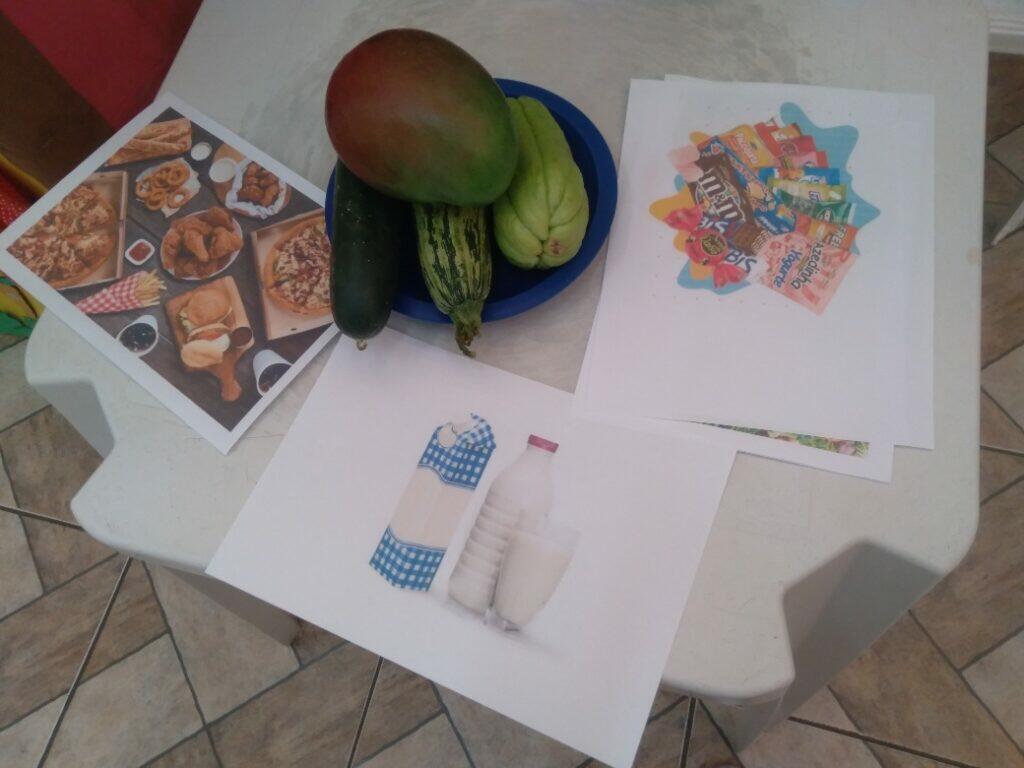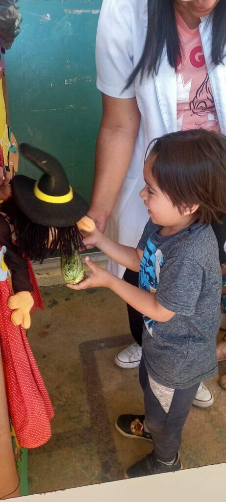 A atividade para a pré-escola também foi realizada no teatro de fantoche, sendo a personagem a bruxinha Sabrina também manipulada pela nutricionista Rosa. A Nutricionista Julieth responsável pela Unidade Escolar interagiu com os personagem e com as crianças. O enredo abordou, de forma lúdica, a importância da alimentação saudável, incentivando o consumo de frutas, verduras, arroz e feijão, além do equilíbrio no consumo de doces. Depois a Nutricionista Julieth convidou algumas crianças e apresentou uma fruta ou legumes e as crianças adivinharam o nome dos alimentos e a bruxinha experimentou. Durante a atividade foi observado que alguns alunos não conheciam os legumes expostos (chuchu e pepino). Após essa dinâmica, a Nutricionista Julieth apresentou algumas figuras de alimentos saudáveis e alimentos industrializados para as crianças identificarem se faz bem à saúde ou não. Atividades como estas estimulam as crianças a conhecer novos alimentos, e aborda um tema importantíssimo que é os hábitos alimentares saudáveis.