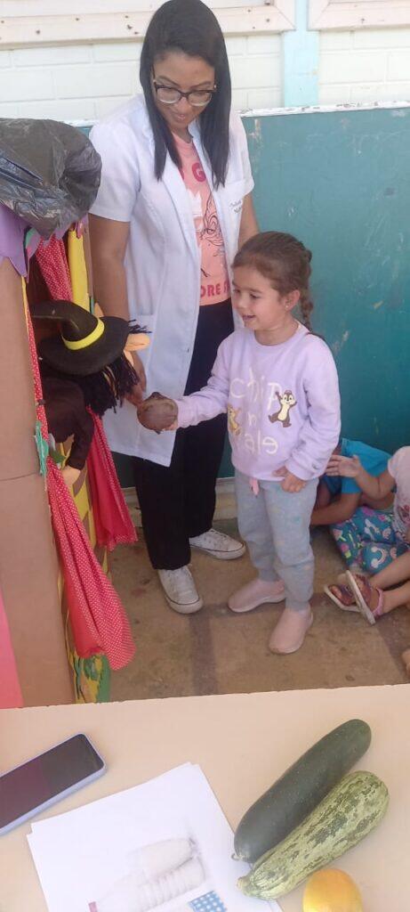 Por fim, ocorreu o momento musical, em que a Nutricionista Julieth cantou a música “Sopa do neném” e apresentou figuras feitas de EVA durante a apresentação musical, que animou ainda mais as crianças.