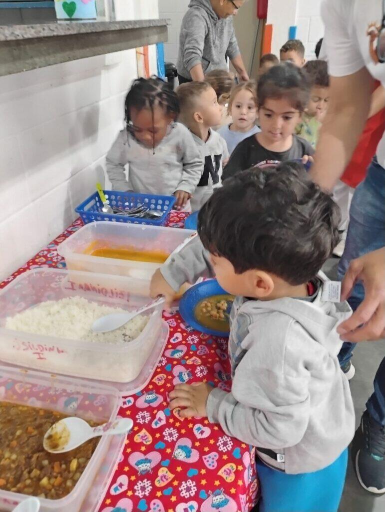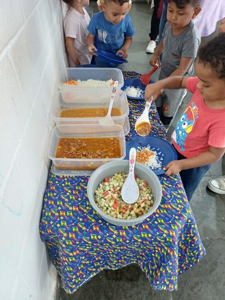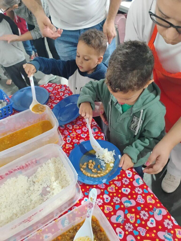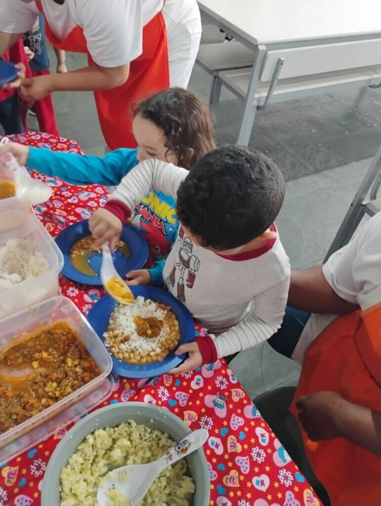 Ao se servir, os pequenos exploraram cores, texturas, cheiros e quantidades, fortalecendo não apenas a alimentação consciente, mas também habilidades motoras finas, organização e responsabilidade. O encantamento ficou evidente nos olhares curiosos e na satisfação de realizarem uma tarefa tão significativa por conta própria.
