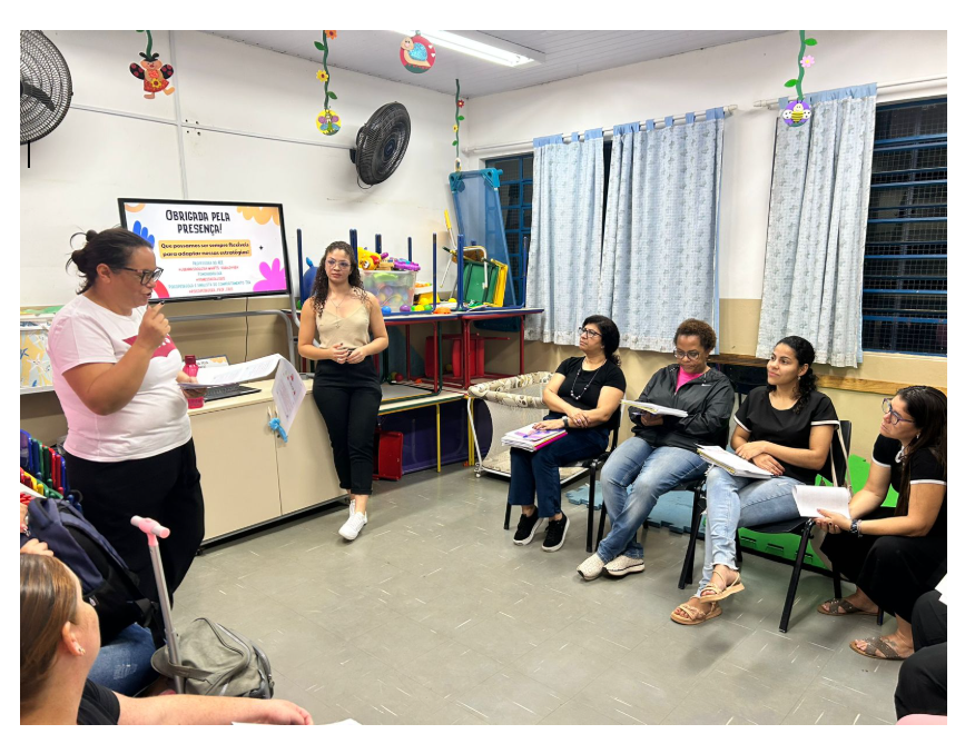 Os HTPCs realizados nas EMEBs Noel Rosa, Paulo Benevides Franco de Godoy, Nair de Sene Fróis e Nilza Dias Mathias tiveram como foco dois temas fundamentais para o fortalecimento das práticas inclusivas: Adaptações Curriculares e Comunicação Aumentativa e Alternativa (CAA).