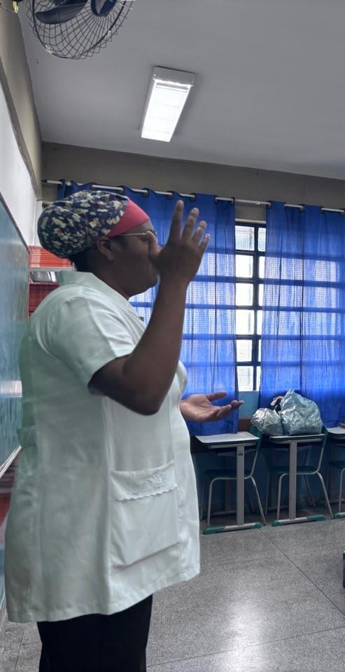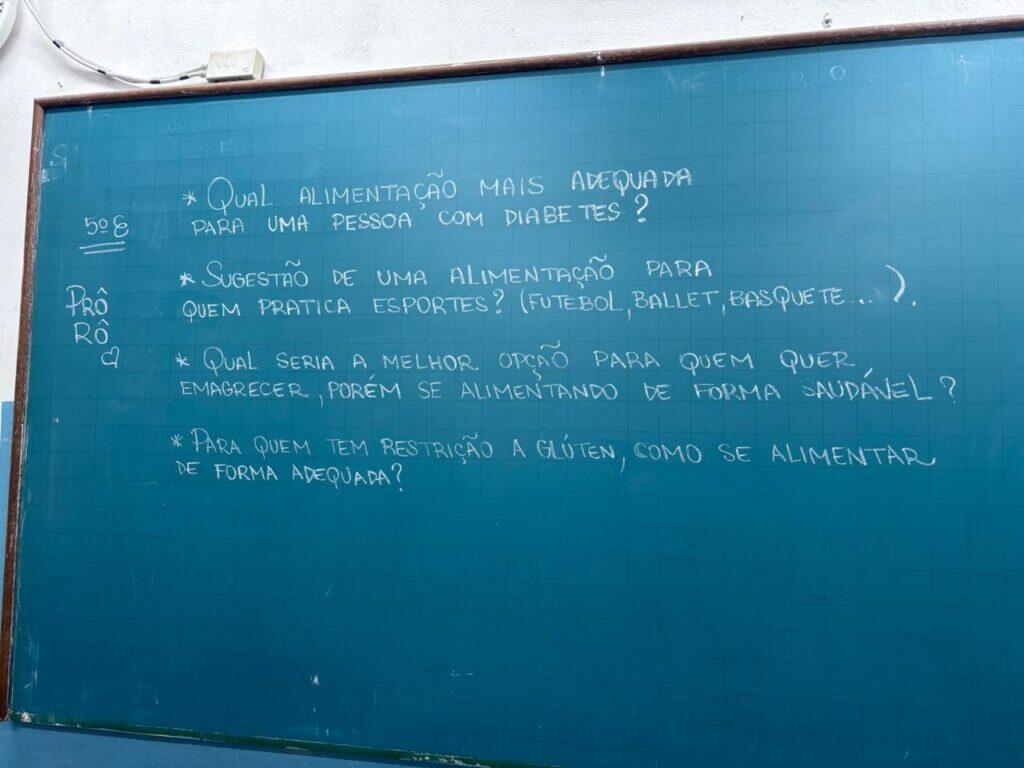 No ensino fundamental, também explicamos a importância de montar um prato colorido, e cada turma elaborou de duas a quatro perguntas. As perguntas eram semelhantes entre as turmas, as perguntas eram as seguintes: Por que não é oferecido suco natural? Por que não tem saladas de frutas com sobremesa? Por que a escola não serve sorvete? Qual a alimentação mais adequada para uma pessoa com diabetes? Sugestão de uma alimentação para praticar esportes? (Futebol, ballet, basquete), Para quem tem restrição a glúten, como se alimentar de forma adequada? Como é realizada as compras dos alimentos é feita igual quando vamos ao supermercado? e etc. Todas as perguntas foram respondidas pelas Nutricionistas, as crianças gostaram e aproveitaram muito o momento para aprender mais sobre bons hábitos, restrições e etc.