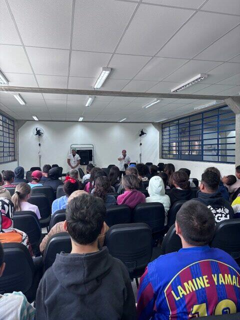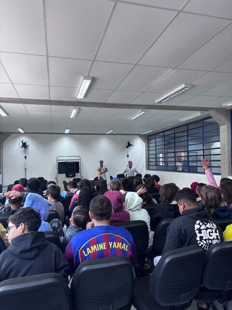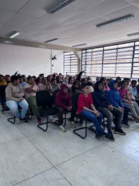 Dito isso, com o objetivo de conscientizar os alunos sobre uma alimentação adequada e saudável, foi realizada uma dinâmica de “Bate-papo com as Nutris” para compartilhar o conhecimento e sanar as dúvidas dos estudantes referente a esse tema e para que saibam fazer escolhas alimentares mais conscientes. Para realização da atividade de EAN, os estudantes foram organizados, por turmas, na sala de aula, e iniciamos o bate-papo com uma introdução sobre o papel da nutricionista na escola, o que é uma alimentação saudável e equilibrada, a importância de um prato colorido e porquê a combinação do arroz com o feijão é tão importante e completa.