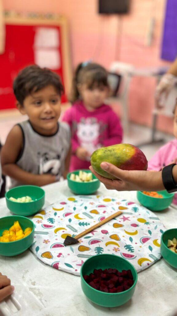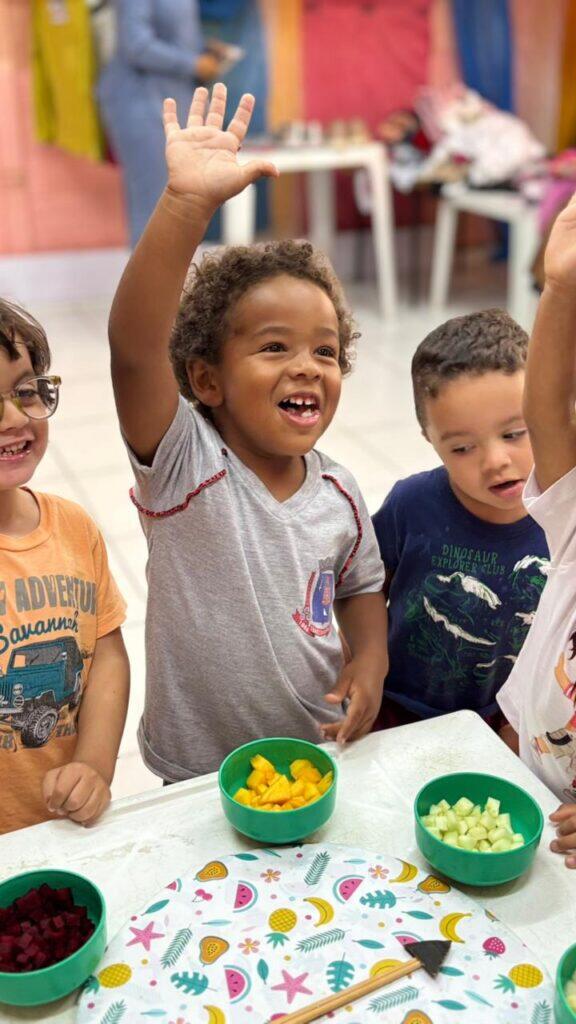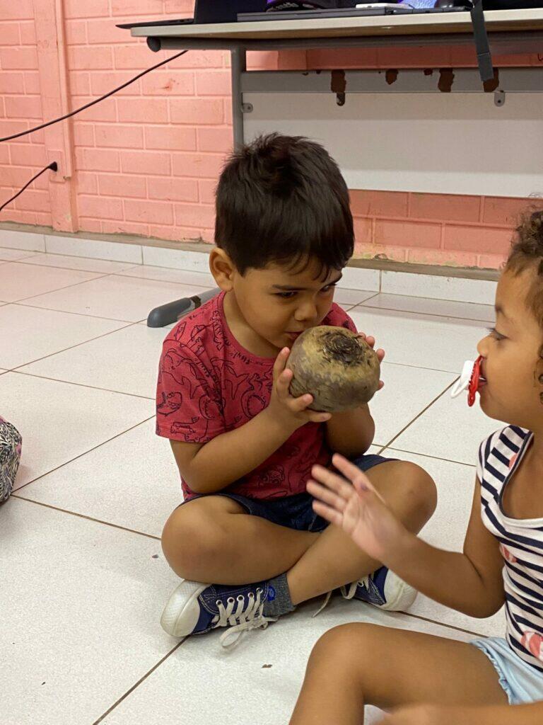 A atividade foi para contribuir com o desenvolvimento da comunicação, expressão e autonomia das crianças, incentivar a experimentar os alimentos ofertados na escola, conhecer diferentes texturas, sabores e aromas e trabalhar a parte de educação nutricional de forma mais lúdica para que a gente consiga maior aceitação nos alimentos servidos na unidade escolar reduzindo a seletividade alimentar.