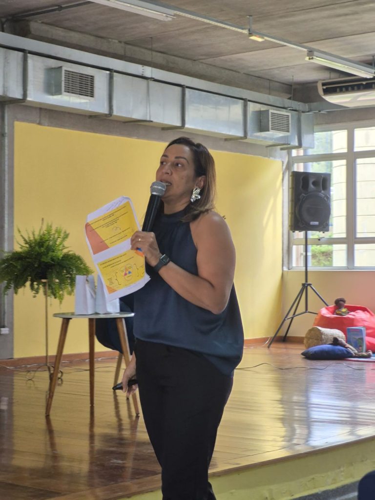 Na sequência, a palestra “Direito à leitura e a leitura literária”, conduzida por Shirley da Silva Santos, mestranda em Educação e integrante da equipe de formadores da Divisão Pedagógica da Educação Infantil, trouxe reflexões sobre a leitura literária como direito das crianças e como prática estruturante do trabalho pedagógico desde a primeira infância. A abordagem destacou a literatura como experiência estética, formativa e promotora do desenvolvimento integral.