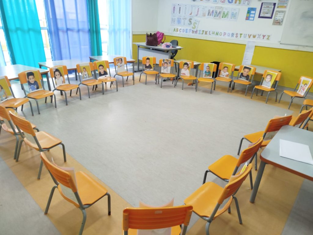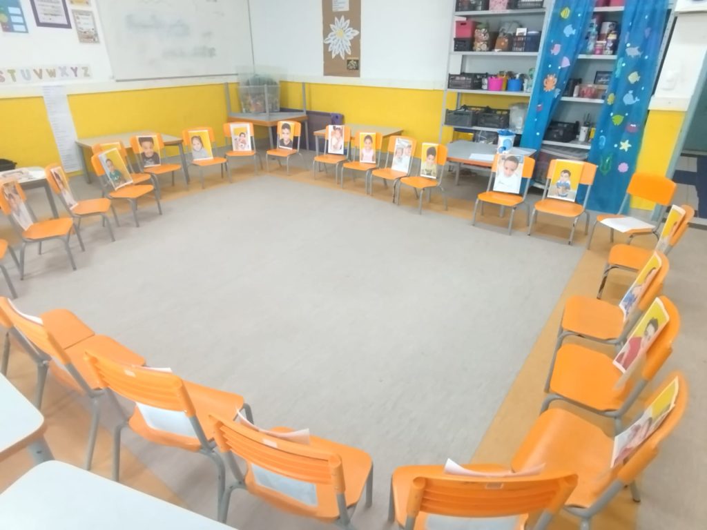 Preparamos a sala com muito carinho, organizando as cadeiras em círculo para que todos pudessem se ver. Em cada lugar, deixamos uma foto do rosto de