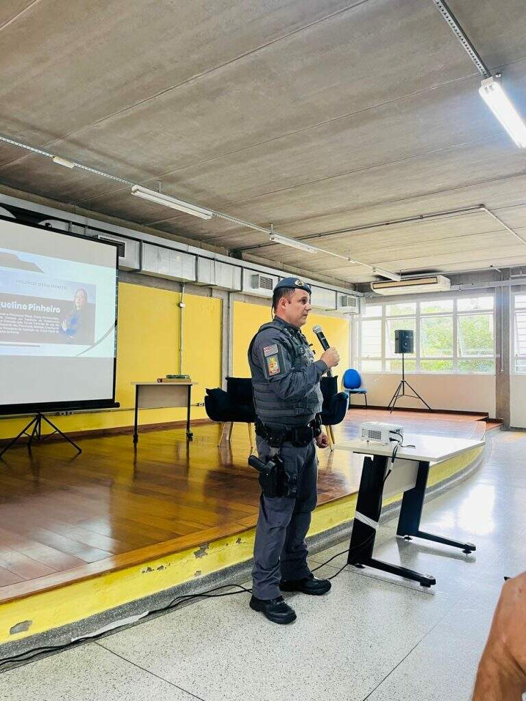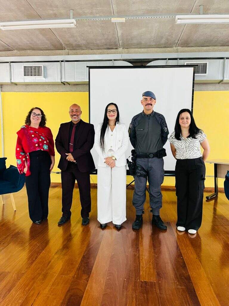 proteção: a advogada Dra. Jaqueline de Souza Pinheiro, representante da Ordem dos Advogados do Brasil (OAB); o Comandante da Polícia Militar de Franco da Rocha, Diego Rodrigues; o Cabo Leandro, representando o 26º Batalhão da Polícia Militar do Estado de São Paulo – Programa PROERD; e a psicóloga Leila Lisboa, representante do Núcleo de Prevenção e Assistência às Vítimas de Violências (NUPAVV).