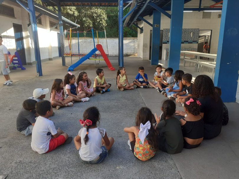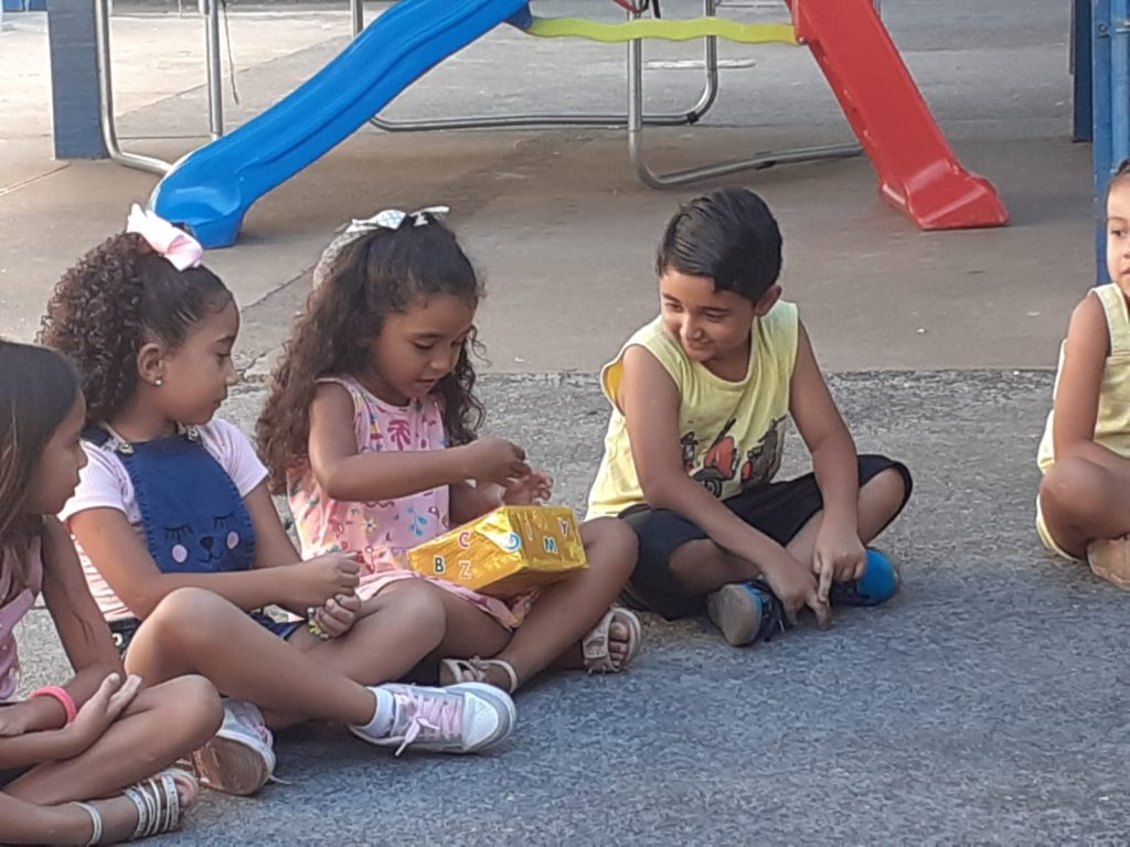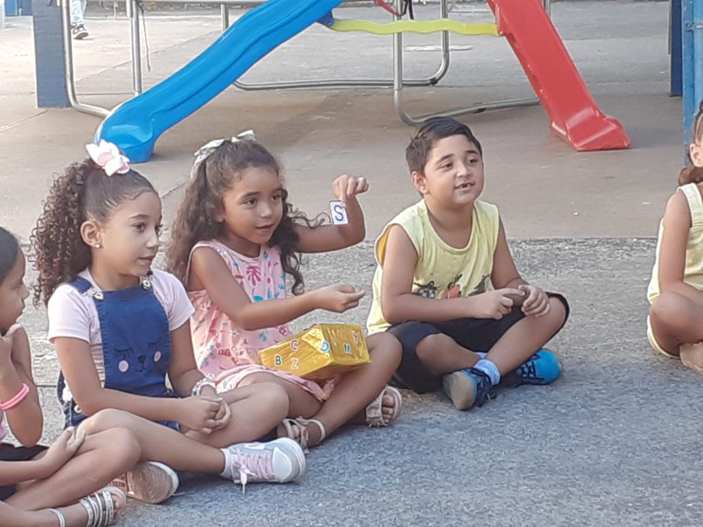A atividade acontece em roda, promovendo a interação entre os alunos. No centro da brincadeira, uma caixa especial — recheada com as letras do alfabeto — começa a circular de mão em mão. Enquanto isso, as crianças, em coro, recitam a parlenda: “Passa a caixa…”, criando um ritmo envolvente que prende a atenção de todos.
