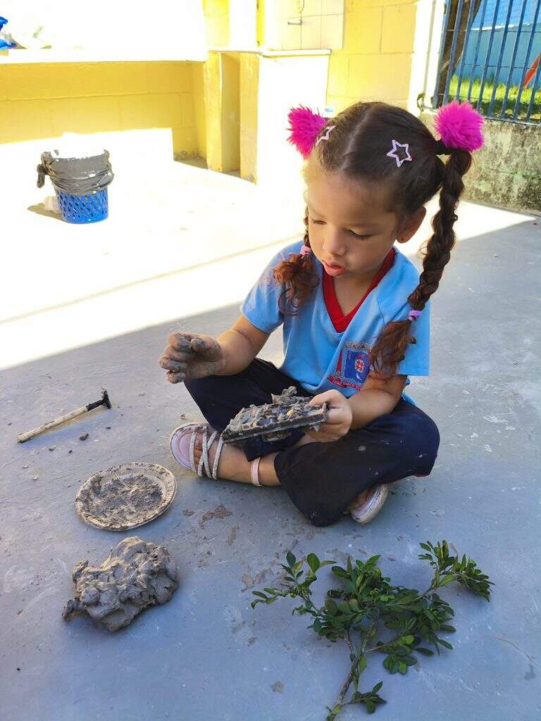 Em um ambiente cuidadosamente organizado, a turma foi convidada a explorar uma diversidade de materiais, como argila, flores, galhos, colheres, cones, pinhas, conchas, pratinhos e forminhas. A proposta favoreceu momentos de investigação, criação e imaginação, respeitando o tempo e a curiosidade de cada criança.
