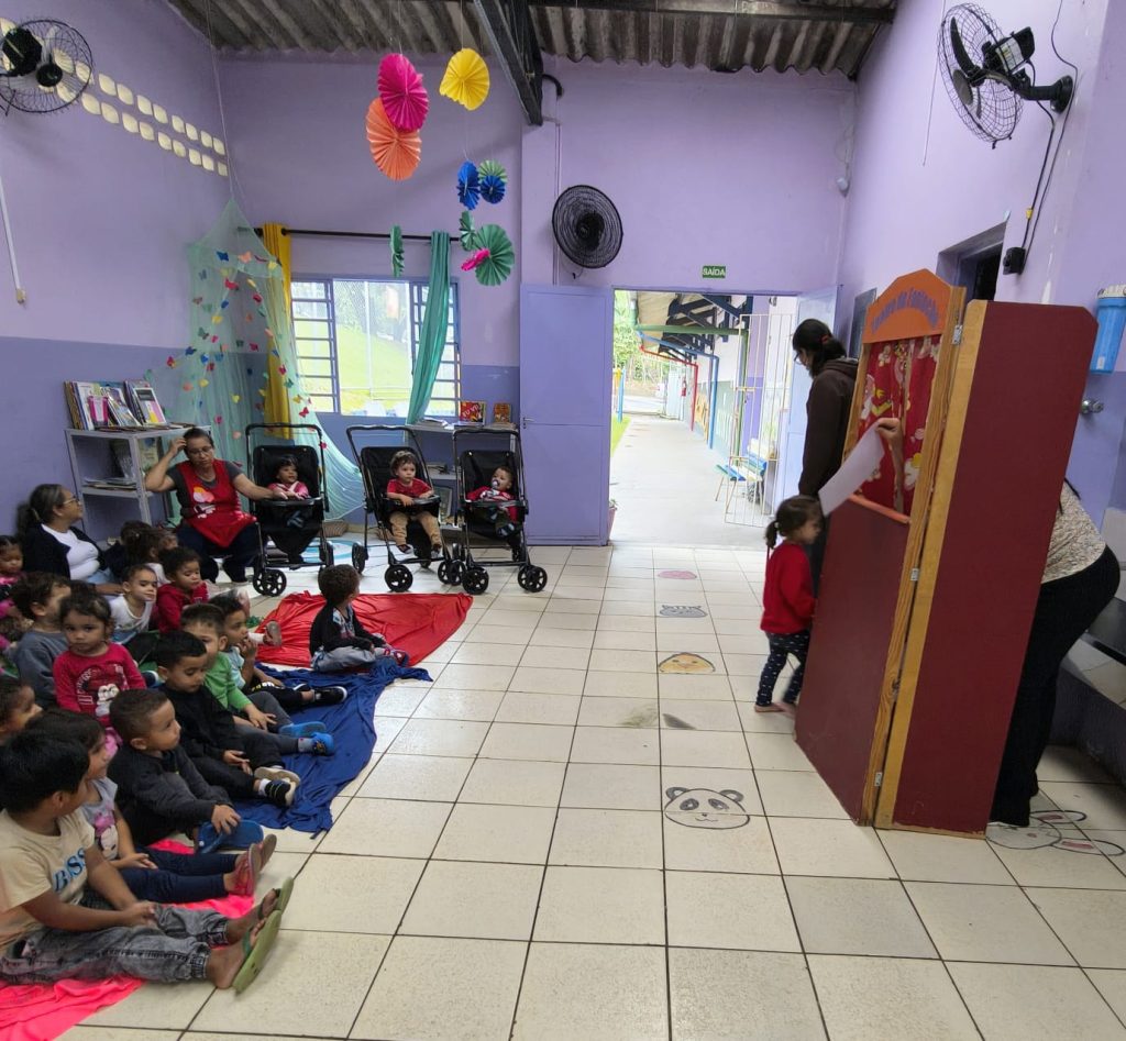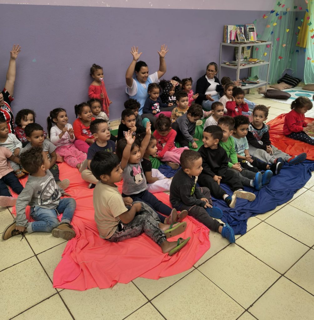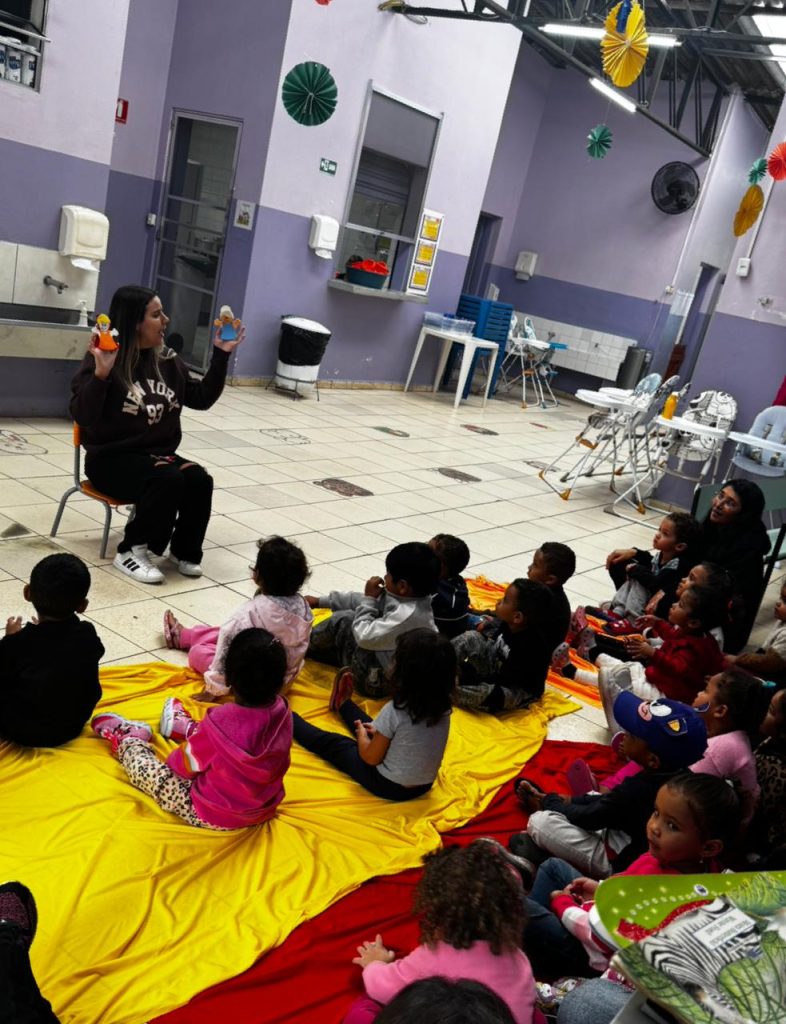 Esse momento coletivo também reforça a importância da literatura no cotidiano escolar, pois aproxima as crianças do mundo dos livros, incentiva a escuta, a atenção, a oralidade e a ampliação do repertório cultural. Ao compartilhar esse instante com colegas de diferentes turmas, a vivência se torna ainda mais especial, fortalecendo os laços entre as crianças e tornando a escola um espaço de descobertas e encantamento.
