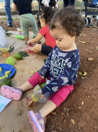 Nossas pequenas Maria e Isis, além de se deliciarem com o abacate amassadinho, surpreenderam ao cuidar dos amigos menores, oferecendo o alimento com gestos cheios de carinho. Perto dali, Heitor se encantava com as folhas do abacateiro, balançando-as e observando seus movimentos.