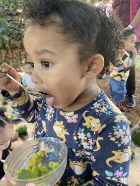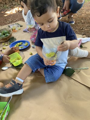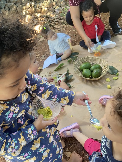 O abacate passou a ser explorado de muitas formas: havia bebê apertando, outro observando com cuidado, alguns levando ao nariz para sentir o cheiro e, claro, muitos experimentando o sabor. Com colheres ou com as próprias mãos, cada um descobria seu jeito de vivenciar aquele momento.