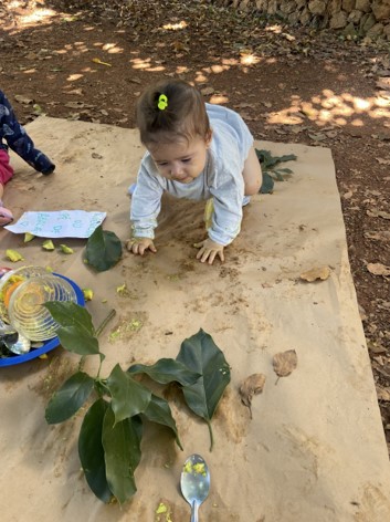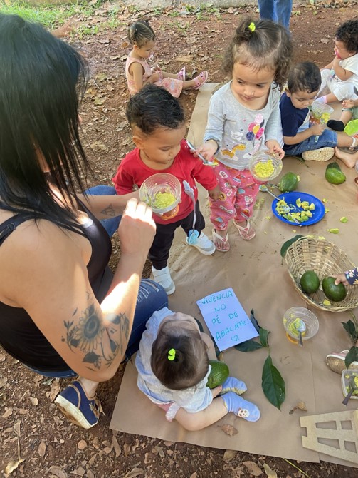 Debaixo de um grande pé de abacate, em uma manhã tranquila, a professora Andréia e as auxiliares Aliane, Tatiane e Adriana prepararam um convite cheio de descobertas para os bebês.
