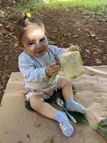 Entre tantas descobertas, a pequena Maria Vitória, ao terminar seu potinho, não quis saber de parar: saiu engatinhando em busca de mais abacate. Já outro bebê, com o olhar atento e o incentivo das educadoras, fez uma grande descoberta ao observar os abacates lá no alto da árvore.