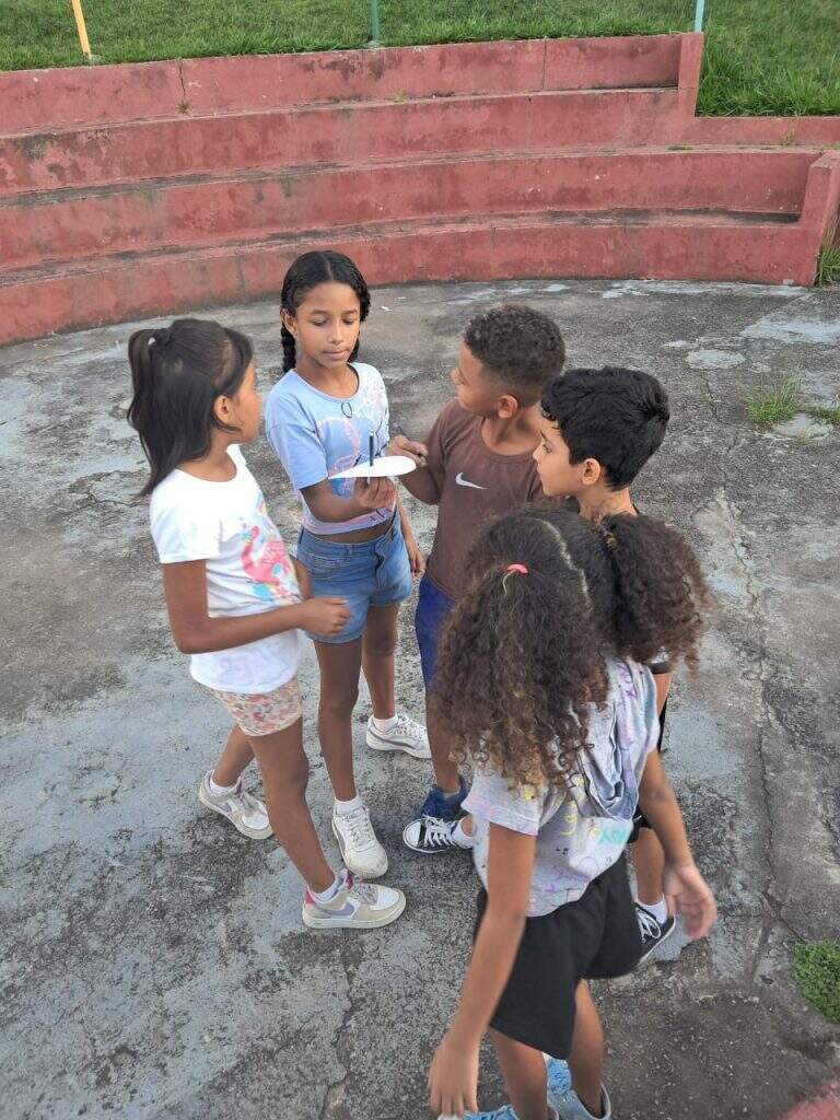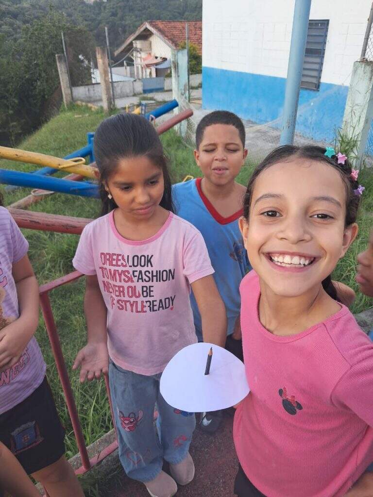 Dando continuidade ao percurso formativo, na aula de Ciências os alunos foram organizados em grupos e desafiados a construir um relógio de sol utilizando materiais simples: papelão, papel sulfite e lápis. O lápis, posicionado no centro de um círculo de papelão, representava o ponteiro do relógio.