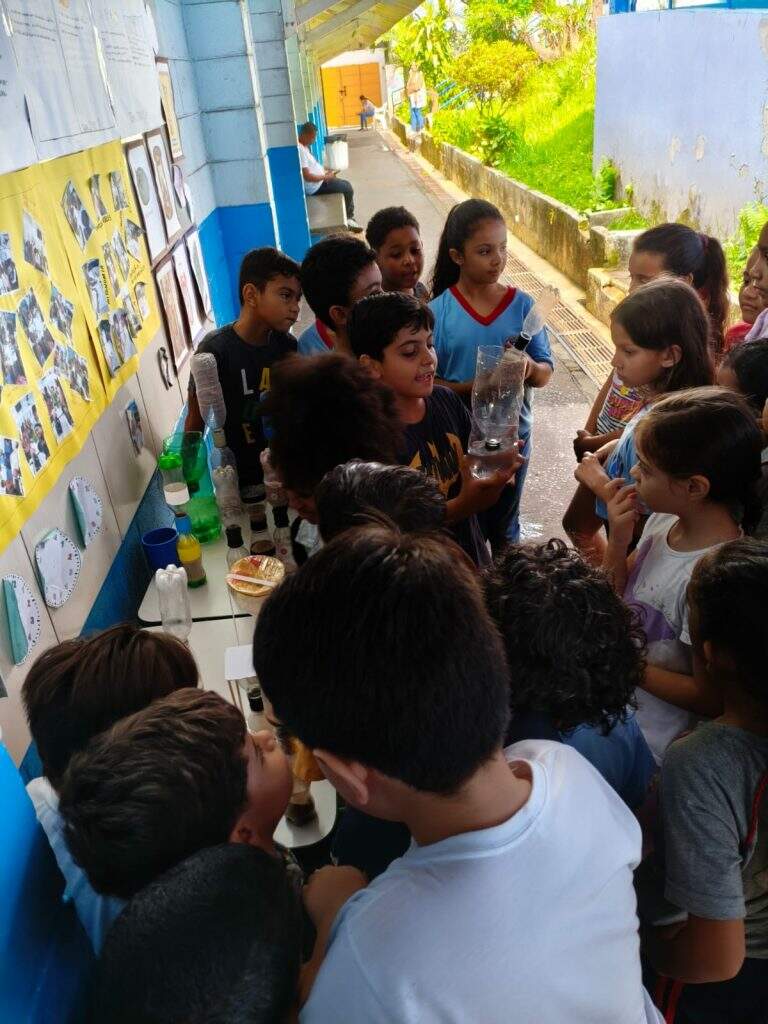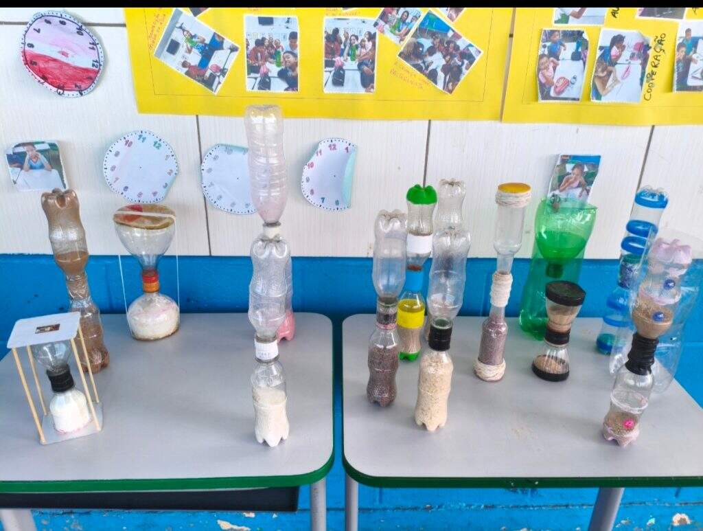 Na sala de aula, também colocamos a mão na massa e construímos um relógio de água com garrafa PET. A experiência foi acompanhada com muita atenção: a cada minuto que passava, fazíamos marcações, observando o fluxo da água e relacionando com a passagem do tempo.