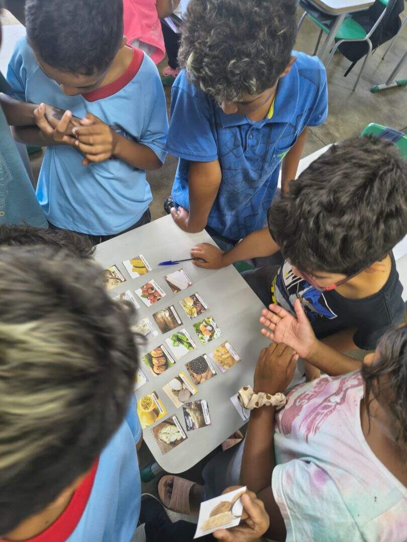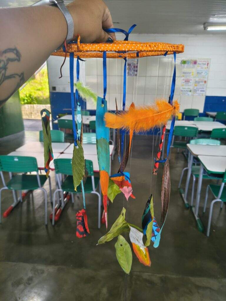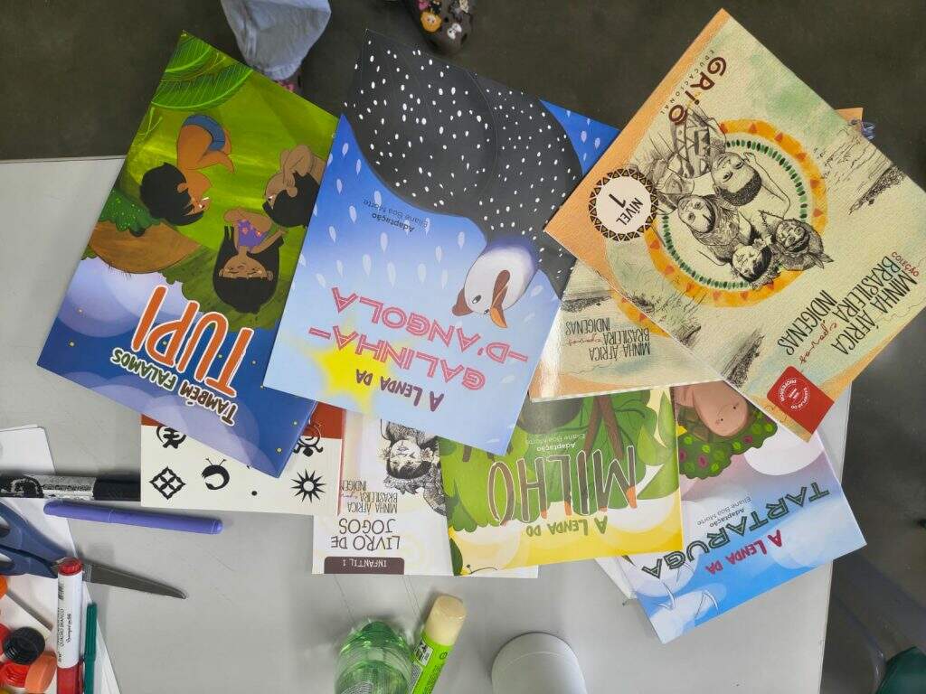 também fizeram parte das vivências, estimulando o trabalho coletivo, a criatividade e o respeito às diferentes culturas. Para complementar, foram proporcionados momentos de apreciação literária, incluindo a leitura de lendas indígenas e africanas, ampliando o repertório cultural dos alunos.